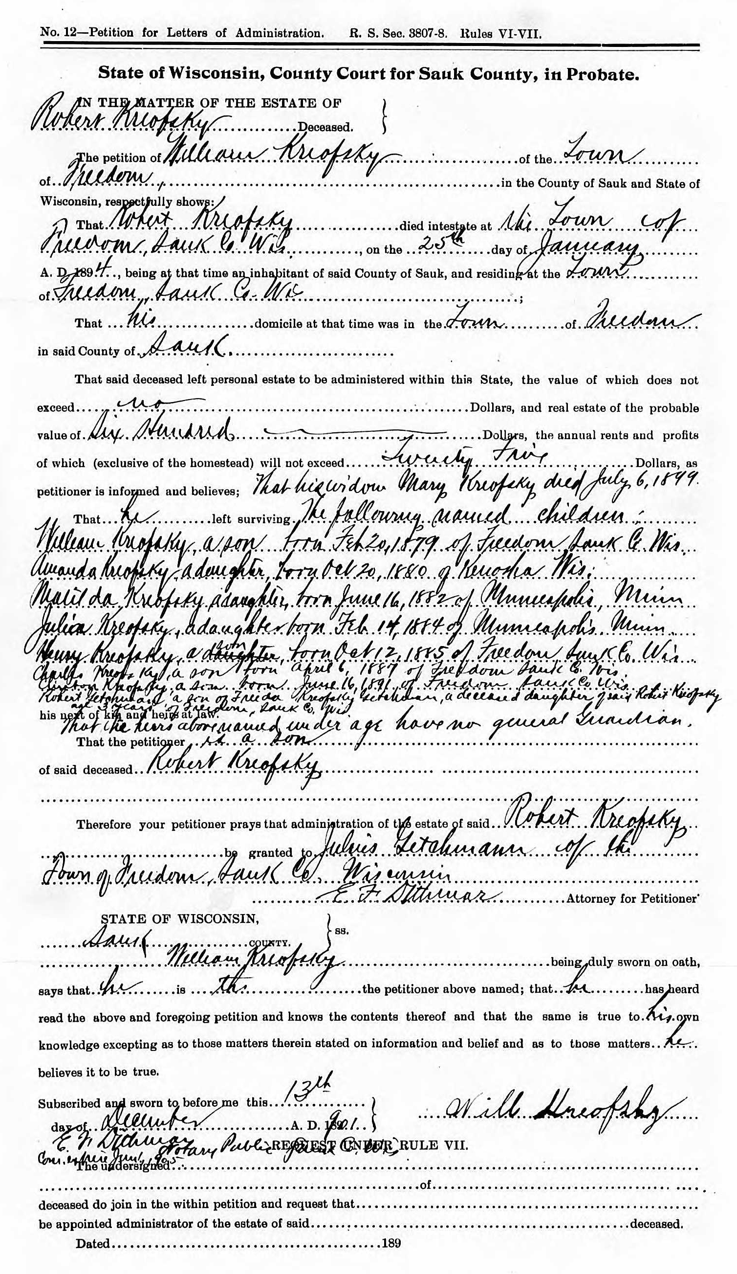 | Father* | Robert Kreofsky b. c 1840, d. 25 Jan 1894 |