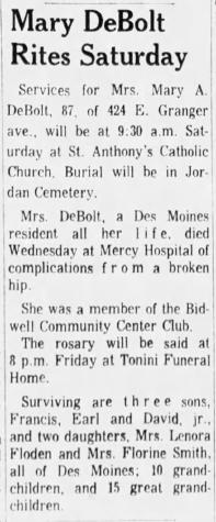 - Mary Luella Debolt b. 9 Nov 1912, d. 10 Jan 1941