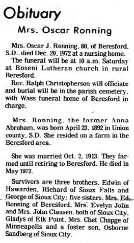 Child of Anna Gustine Abraham and Oscar Julius Ronning