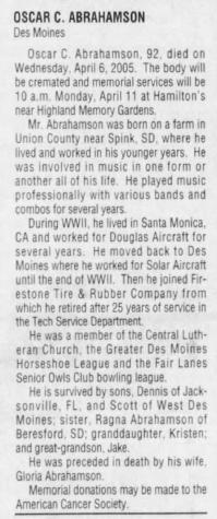 - Duane Oliver Abraham b. 4 Mar 1939, d. 6 Nov 1997