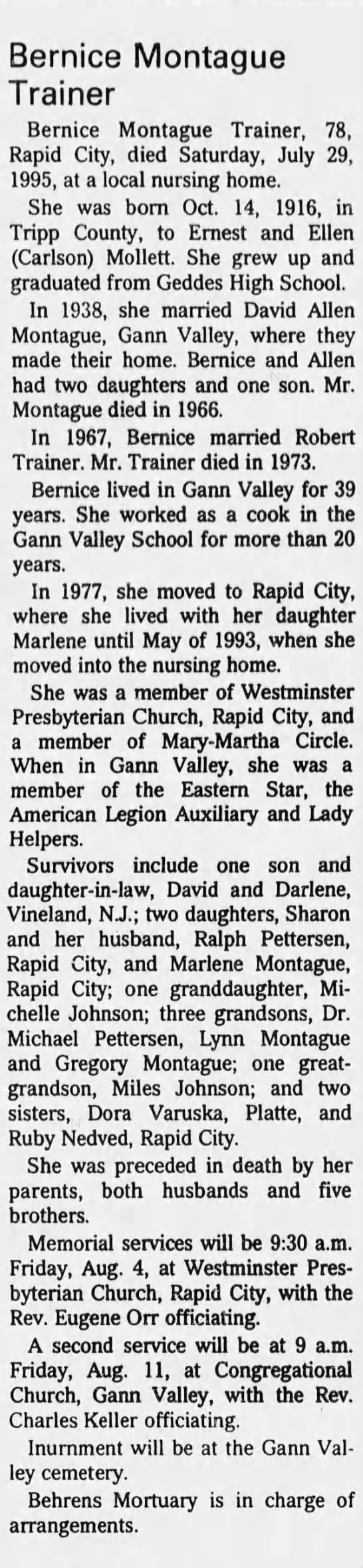 - Bernice Ellen Mollet+ b. 14 Oct 1916, d. 29 Jul 1995