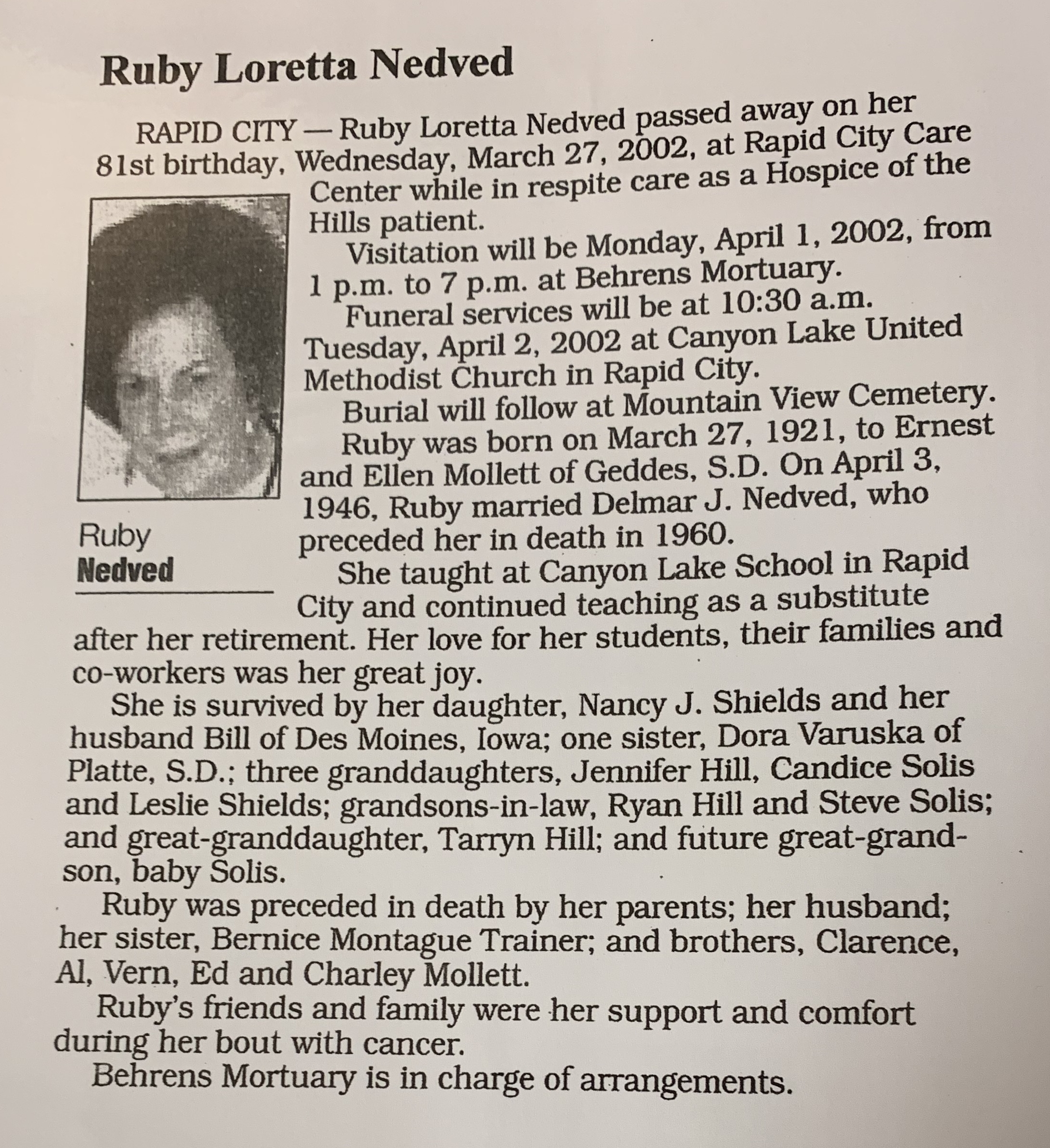 - Ruby Loretta Mollet+ b. 27 Mar 1921, d. 27 Mar 2002