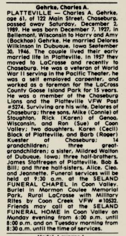 - Charles A. Gehrke+ b. 7 Dec 1927, d. 2 Dec 1989