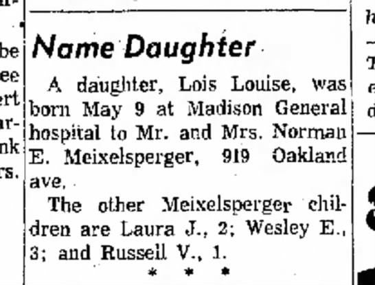 - Lois Louise Meixelsperger b. 9 May 1960, d. 13 Oct 1960
