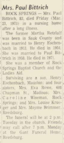 - Martha A. Retzlaff+ b. Mar 1890, d. 23 Mar 1973