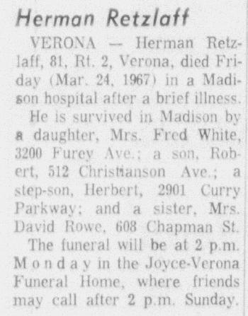 - Herman Retzlaff+ b. 1 Jan 1886, d. 24 Mar 1967