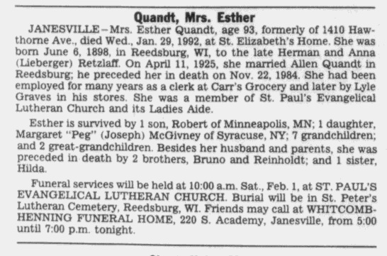 | Mother* | Martha A. Retzlaff b. Mar 1890, d. 23 Mar 1973 |
