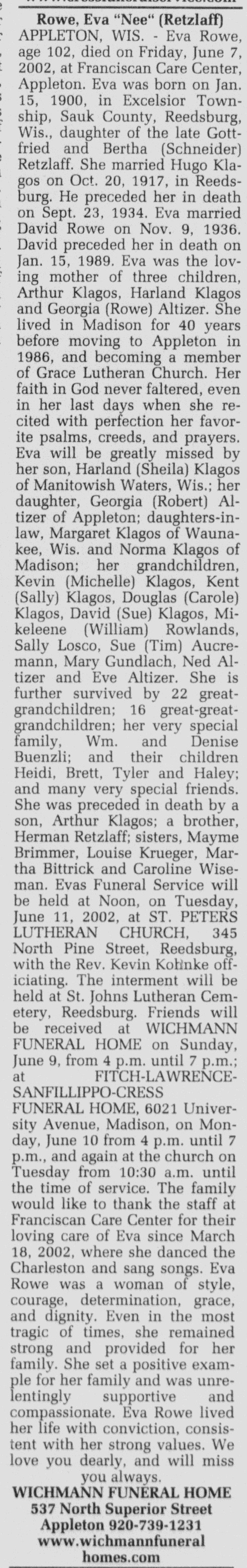 - Eva F. Retzlaff+ b. 15 Jan 1900, d. 7 Jun 2002