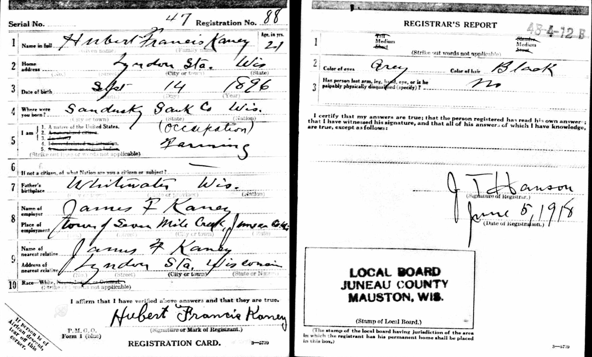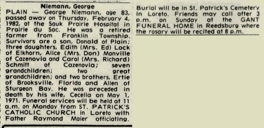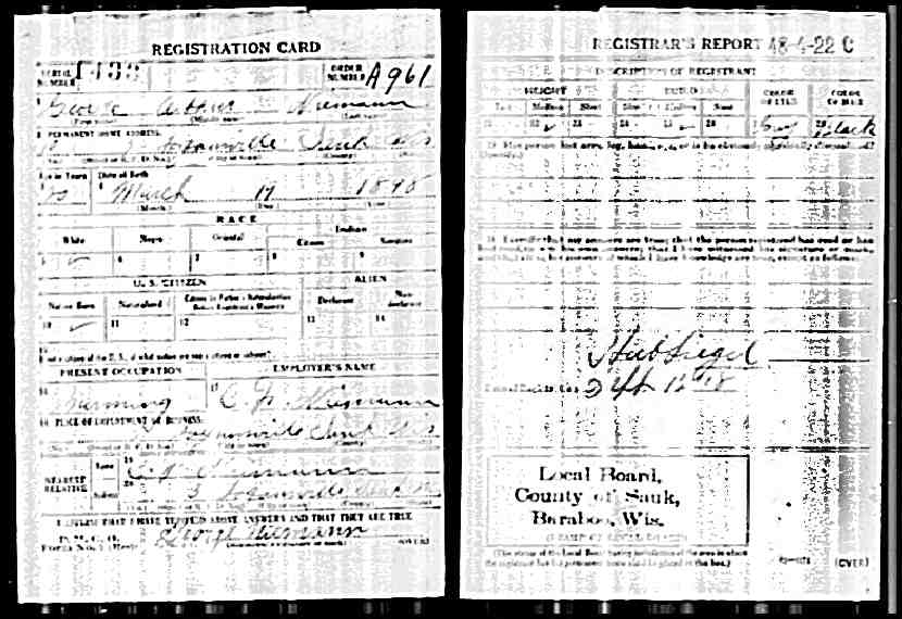 - [S6] Wisconsin, Wisconsin Vital Record to 1907, George A Niemann born 19 Mar 1898 Sauk County Reel 265 Record 1062.