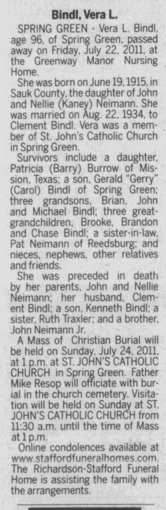 Child of Vera Lorraine Niemann and Clemance Joseph Bindl