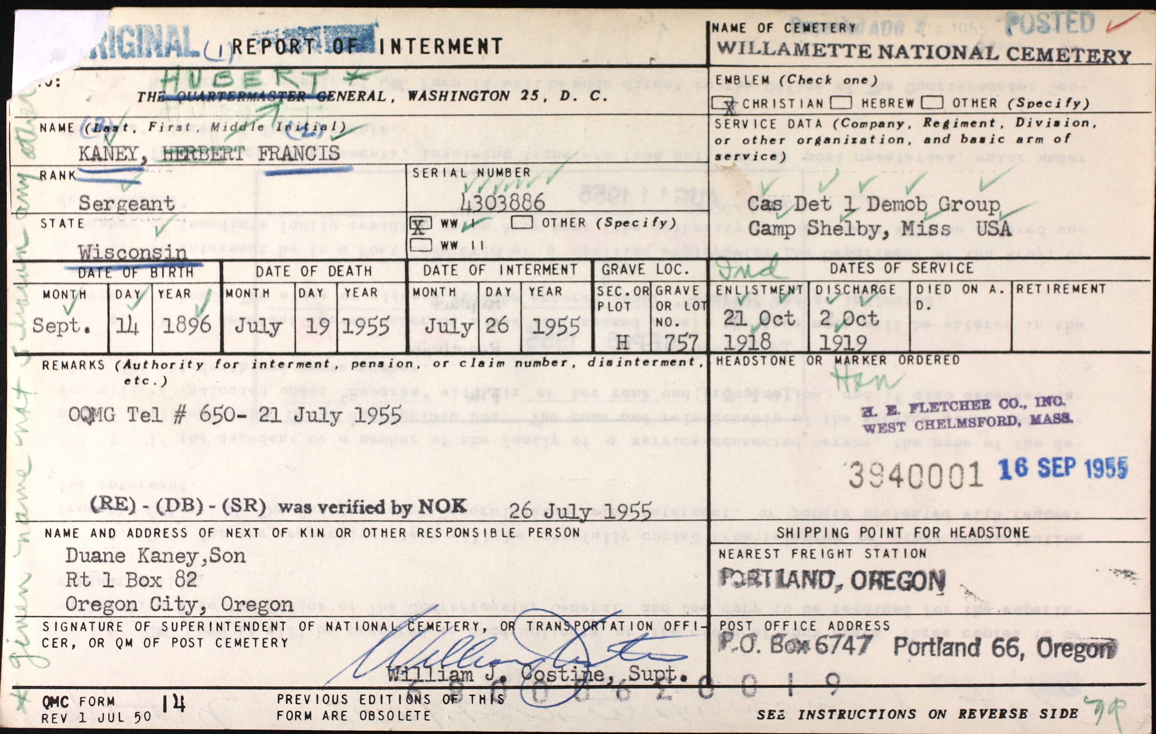 - [S276] Willamette National Cemetery, online http://www.interment.net/data/us/or/multnomah/willanat/, Plot: H 0 757.