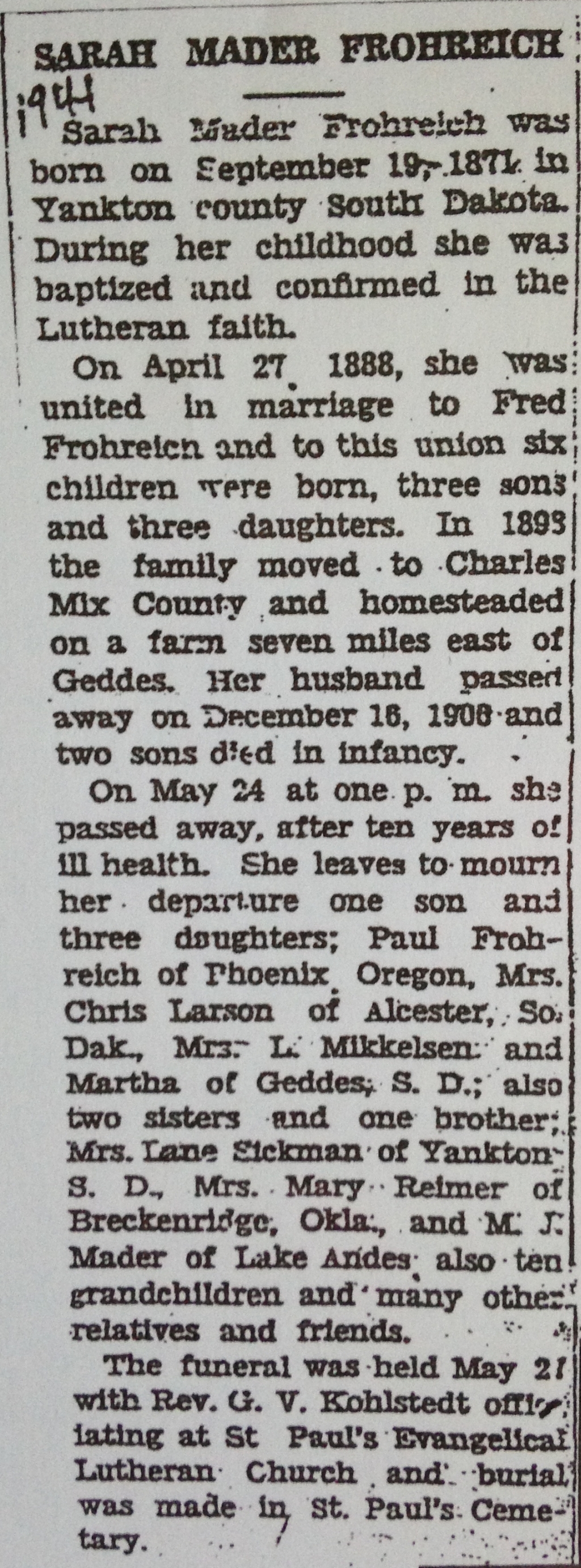 Children of Sarah Mader and Friedrich Wilhelm Frohreich