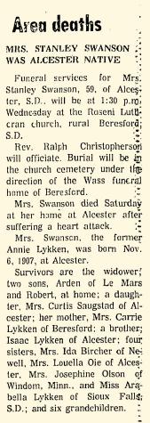 - [S373] U.S. Federal Census 1940 U.S. Federal Census, by Ancestry.com, Year: 1940; Census Place: Paxton, Redwood, Minnesota; Roll: T627_1951; Page: 2B; Enumeration District: 64-21.
