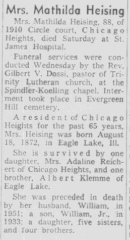 - Adaline Heising b. 12 Sep 1909, d. 10 Jan 1985