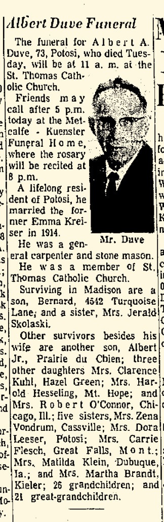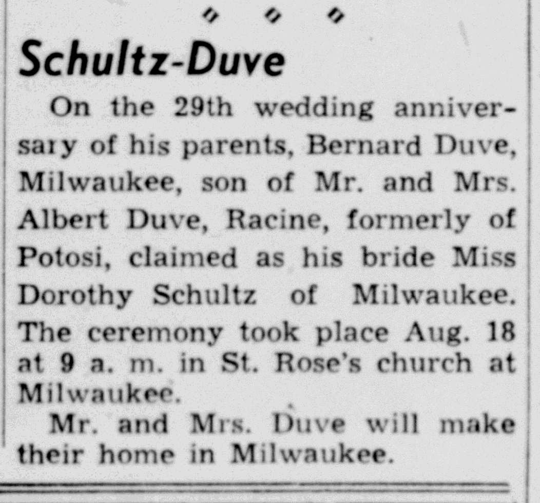 - Bernard F. Duve b. 25 Jun 1921, d. 23 Jan 2013