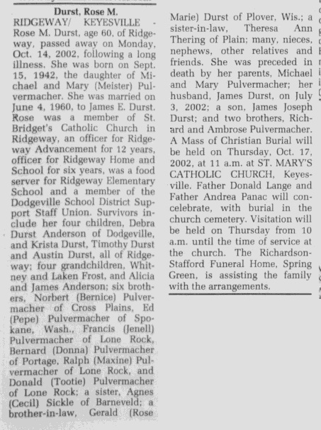Child of James Edward Durst and Rose Mary Pulvermacher