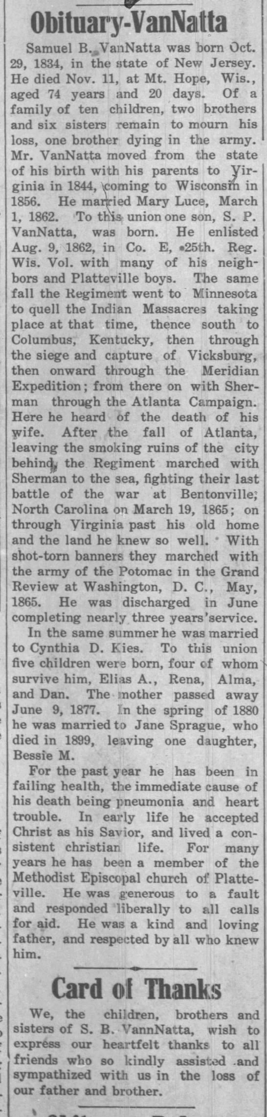 - Samuel B. VanNatta+ b. 29 Oct 1834, d. 17 Nov 1908