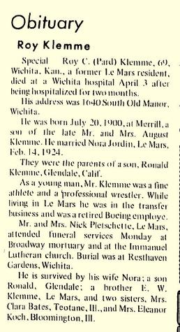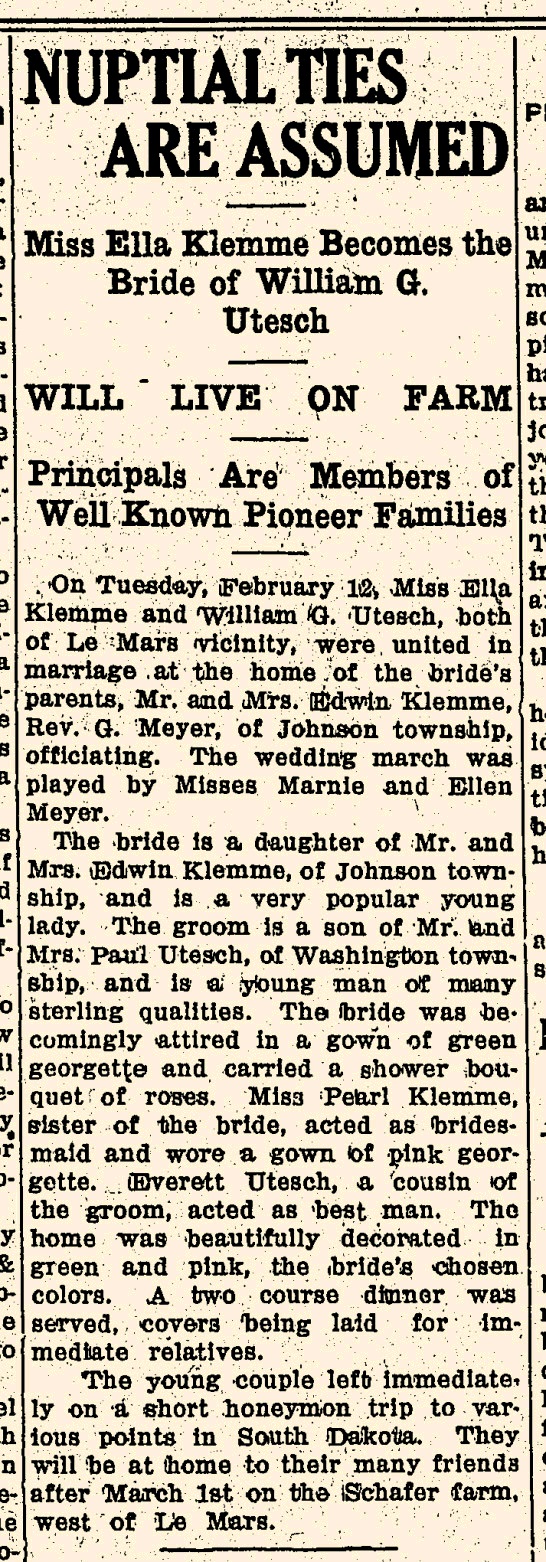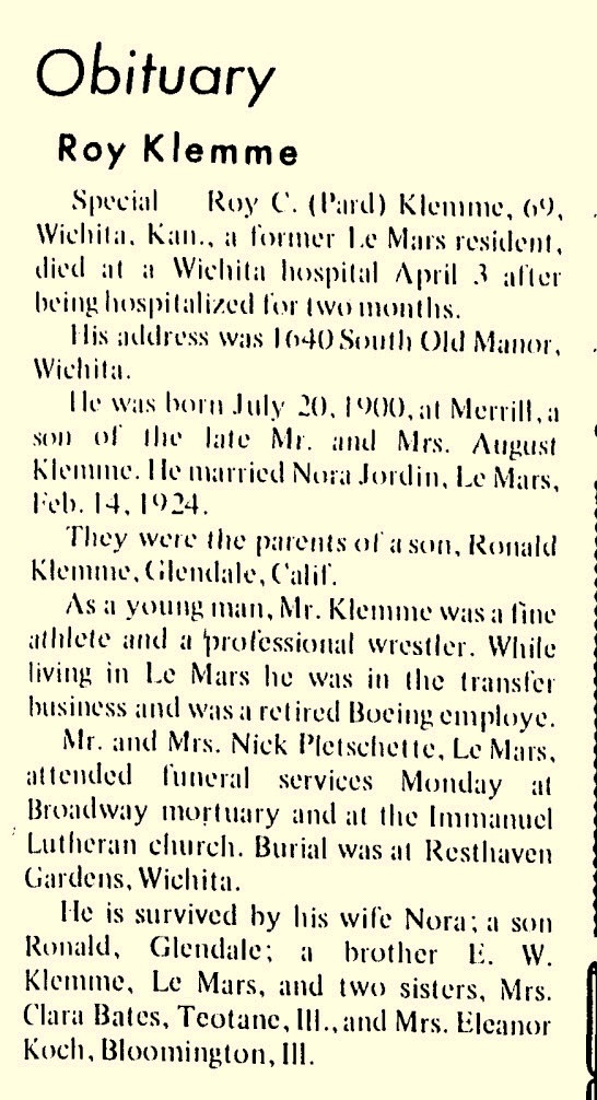 - [S271] Historical Newspaper Collection, Lemars Semi Weekly Sentinel (Le Mars, Iowa) 1951 February 27.