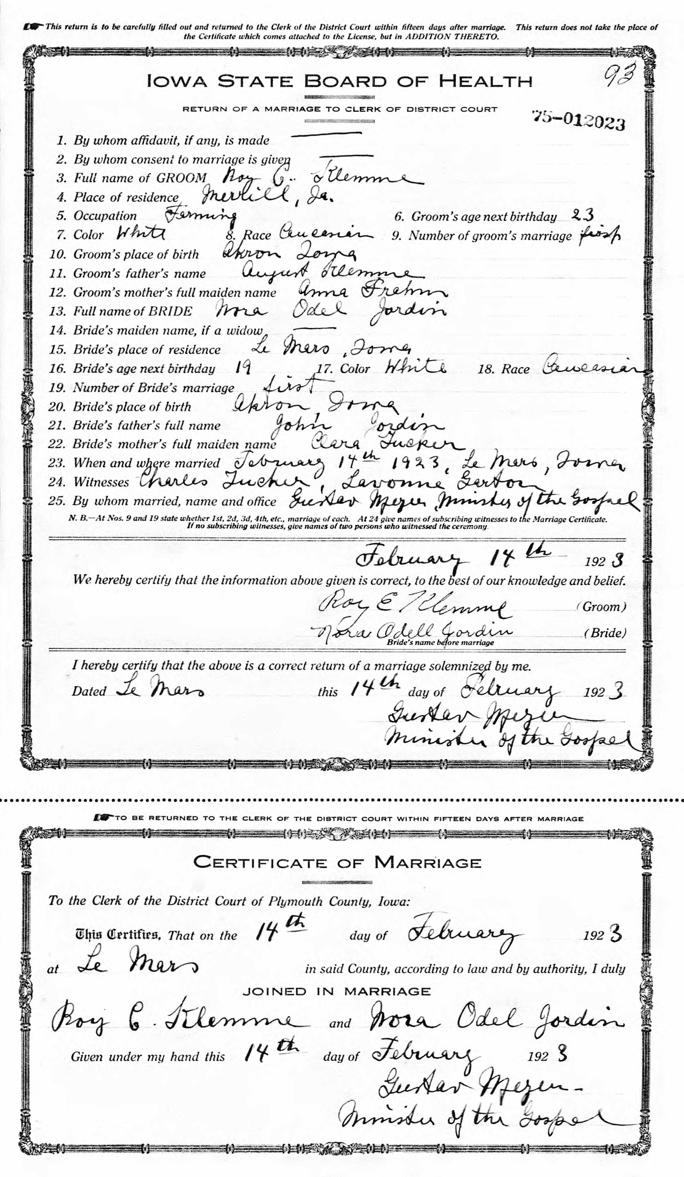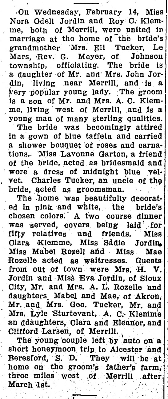 Child of Roy Christian Klemme and Nora Odell Jordin