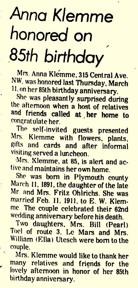 - Ella Anna Klemme+ b. 31 Jan 1912, d. 7 Feb 2004