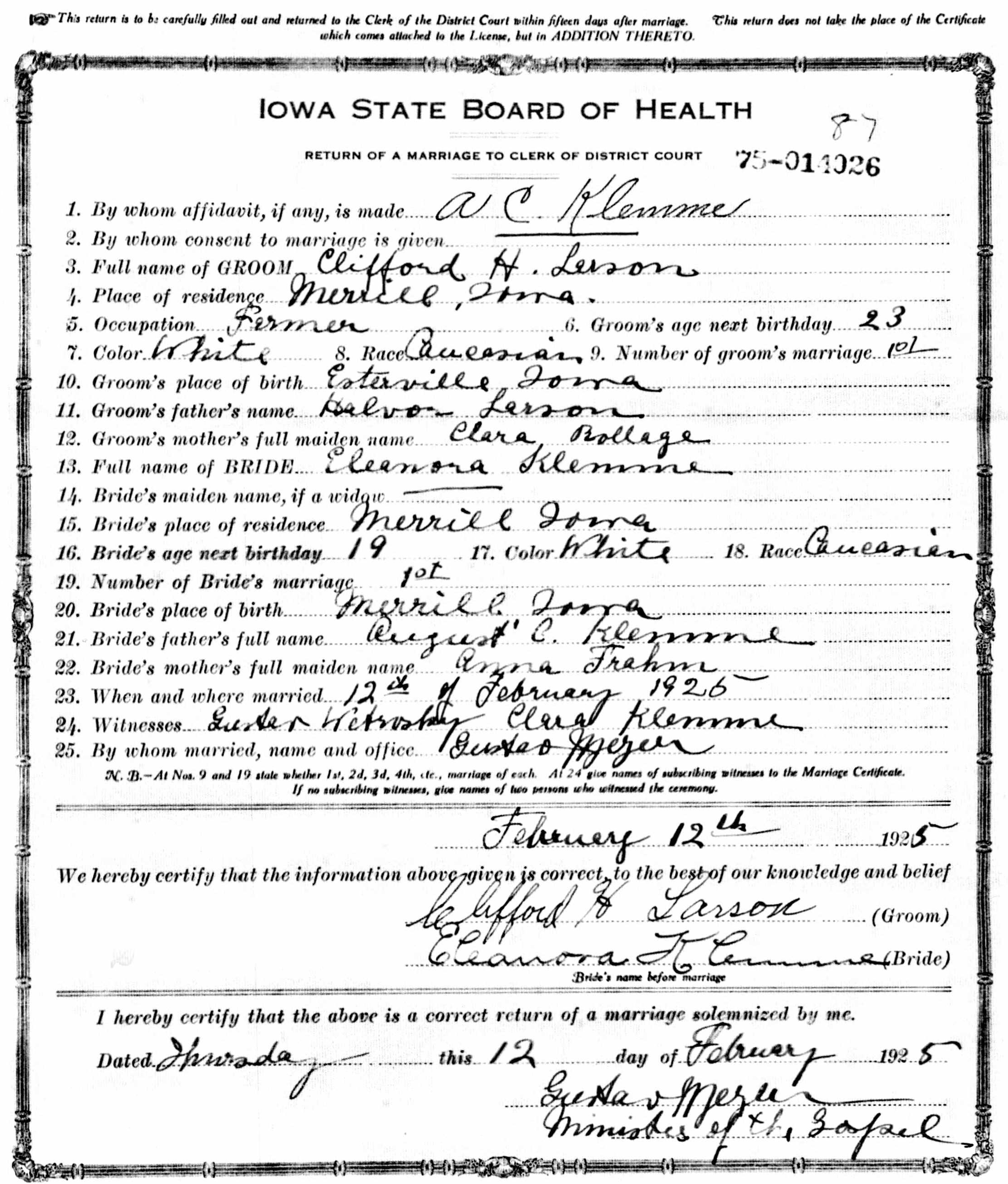 - [S244] U.S. Federal Census 1910 U.S. Federal Census, by Ancestry.com, Year: 1910; Census Place: Merrill, Plymouth, Iowa; Roll: T624_418; Page: 10B; Enumeration District: 0118; Image: 385; FHL microfilm: 1374431.