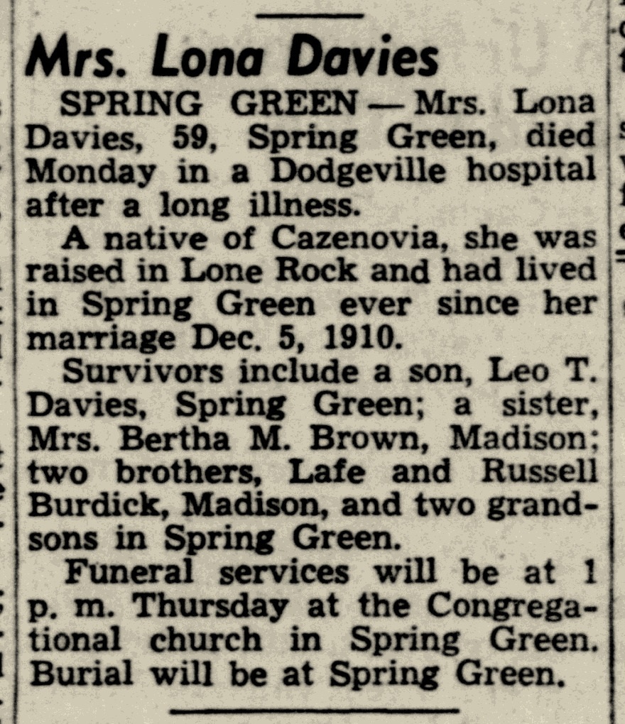 - Lona Sophia Burdick+ b. Aug 1889, d. Dec 1948
