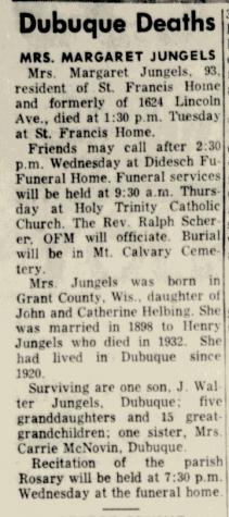 - [S387] Family Search; Multiple Records, "Wisconsin, County Marriages, 1836-1911," database, FamilySearch (https://familysearch.org/ark:/61903/1:1:XRJX-WYV : 3 June 2016), John Helbing in entry for Henry Mary Jungels and Margaret Helbing, 13 Feb 1899; citing , Grant, Wisconsin, United States, Wisconsin Historical Society, Madison; FHL microfilm 1,266,664.