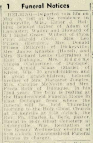 - Wilfred A. Helbing b. 4 Apr 1923, d. 23 Dec 1923