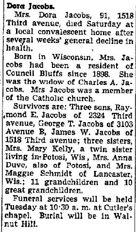 - [S373] U.S. Federal Census 1940 U.S. Federal Census, by Ancestry.com, Year: 1940; Census Place: Council Bluffs, Pottawattamie, Iowa; Roll: T627_1198; Page: 4A; Enumeration District: 78-29A.