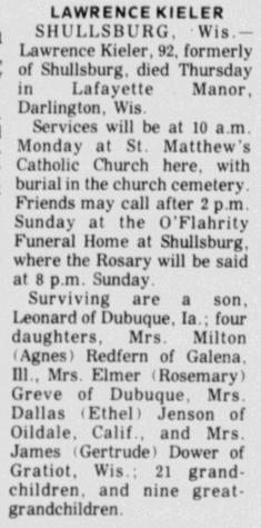 - Lawrence George Kieler+ b. 20 Feb 1879, d. Jan 1972